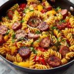 A hearty and flavorful Autumn Beef Sausage Pasta featuring roasted butternut squash and Brussels sprouts, tossed with smoky beef sausage, garlic, and fresh thyme. This comforting dish balances savory sausage with sweet roasted vegetables, perfect for a cozy fall meal.