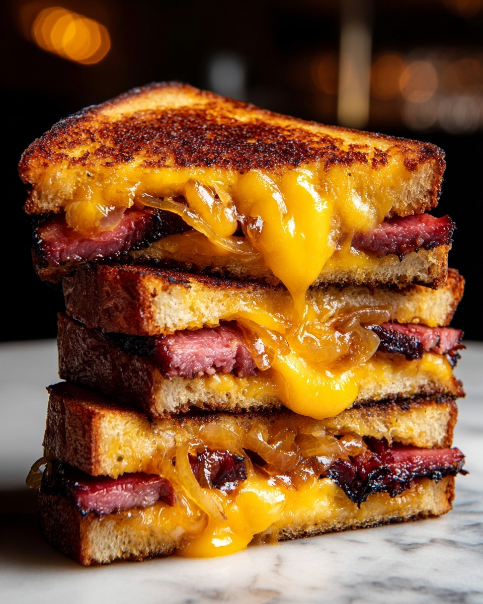 BBQ Brisket Melts are a deliciously hearty sandwich featuring tender shredded beef brisket coated in tangy barbecue sauce, melted cheddar and mozzarella cheeses, and caramelized red onions all toasted to perfection on buttery sourdough bread. This quick stovetop recipe is perfect for a comforting lunch or dinner with rich smoky flavors and gooey melted cheese.
