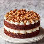 - Assemble the Cake: Once the cakes have fully cooled, place one layer on a serving plate or cake stand. Spread a generous amount of cream cheese frosting over the top. Place the second cake layer on top and frost the top and sides evenly. Garnish with additional chopped walnuts around the top or sides for added texture and presentation.