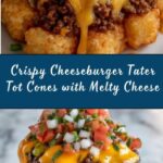 These Cheeseburger Stuffed Tater Tot Cones with a Colossal Cheese Volcano are a fun and delicious twist on classic cheeseburgers. Crispy baked tater tot shells are filled with seasoned ground beef and onions, topped with melty cheddar cheese for a gooey, irresistible finish. Perfect as a party appetizer or a creative family dinner, served with ketchup and mustard for dipping.