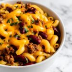 This hearty Chili Mac recipe combines flavorful ground beef chili with creamy macaroni and cheese for a comforting and satisfying meal. Perfect for feeding a crowd, it features a rich mix of seasoned beef, tomatoes, kidney beans, tender macaroni, a creamy cheddar cheese sauce, and a baked cheesy topping garnished with fresh parsley.