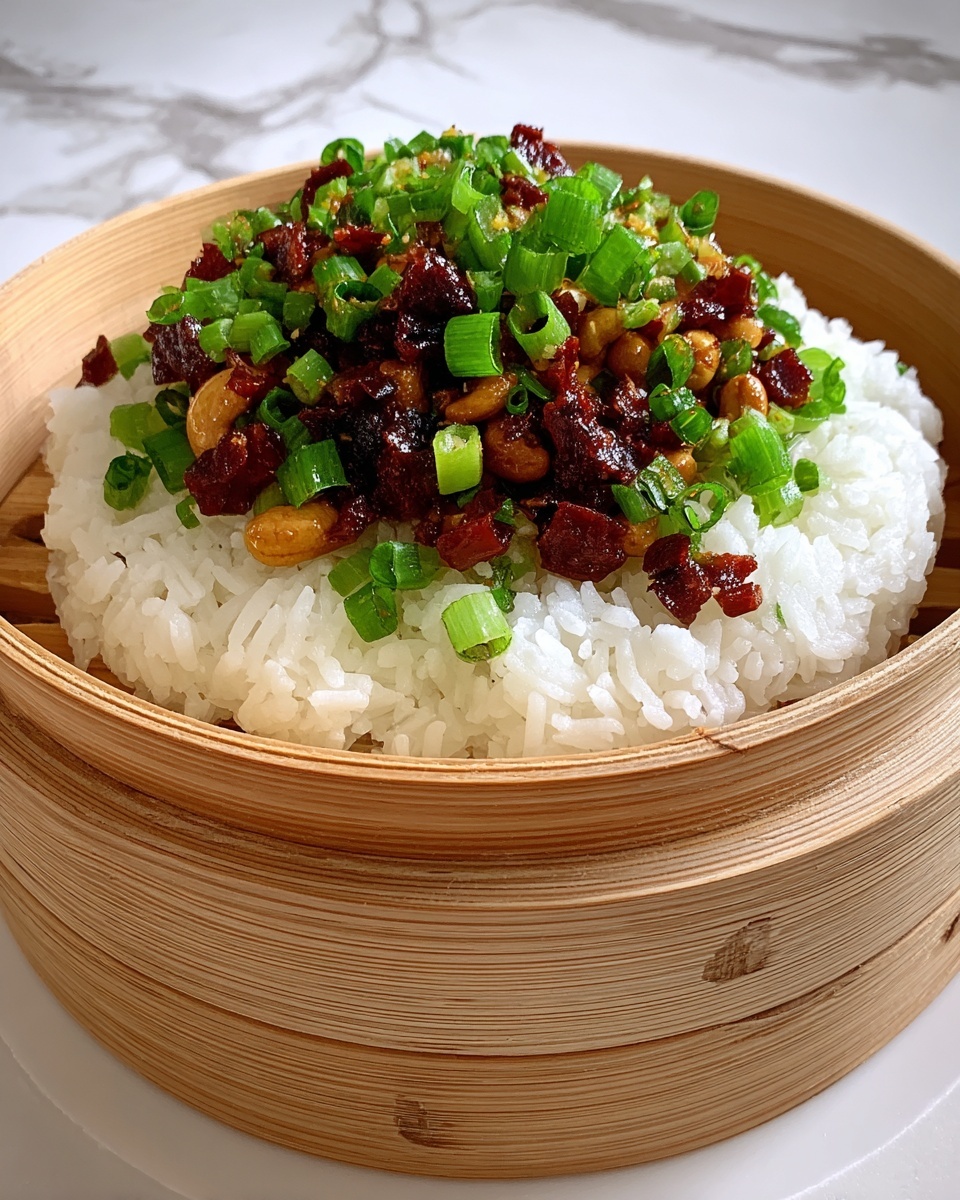 Transfer the rice mixture to a heatproof dish or a bamboo steamer lined with cheesecloth for easy removal. Steam over boiling water for approximately 30 to 40 minutes. This gentle steaming cooks the rice until it’s tender, sticky, and wonderfully fluffy, allowing flavors to meld together beautifully.