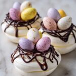 Chocolate Meringue Easter Nests are a delicate and festive dessert perfect for spring celebrations. These light and airy cocoa-flavored meringue nests are crisp on the outside and soft inside, filled with whipped cream or chocolate ganache and decorated with colorful candy eggs for a delightful and visually appealing treat.