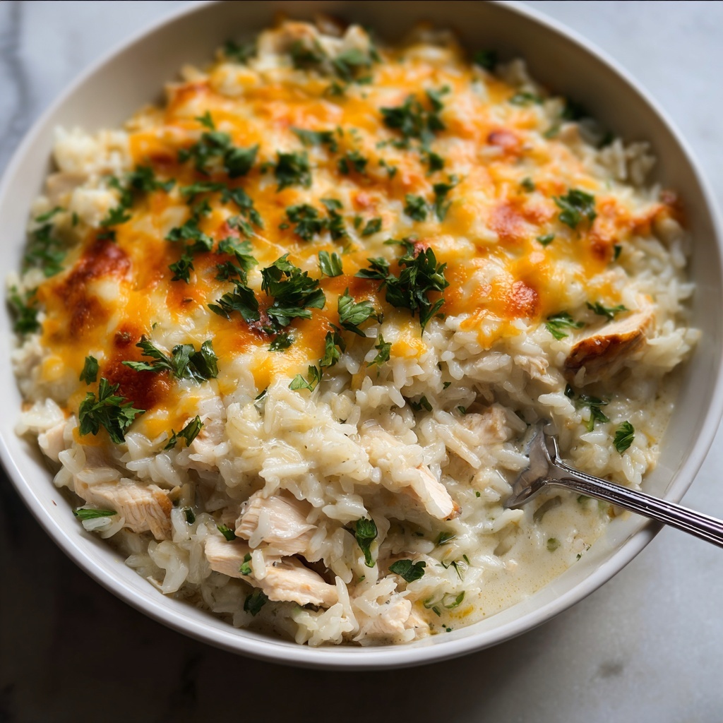 This Creamy Chicken & Rice Casserole is a comforting and hearty meal perfect for family dinners. Tender cubed chicken is baked together with uncooked rice in a creamy mixture of chicken broth, cream of celery soup, and melted butter, then topped with melted mild cheddar cheese for a rich, flavorful finish.