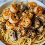 A comforting and creamy mushroom garlic shrimp pasta perfect for quick weeknight dinners. This dish combines tender sautéed shrimp, flavorful mushrooms, and garlic in a luscious creamy sauce, tossed with your favorite pasta and topped with Parmesan and fresh spinach for a delightful meal.