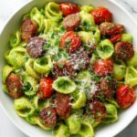 For a dinner party or family meal, serve the sausage pesto pasta in individual shallow bowls, letting the vibrant colors pop. Drizzle a little extra olive oil over each plate and top with microgreens or edible flowers for a stunning presentation that will make everyone at the table excited to dig in.