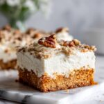 In a large bowl, beat together the softened cream cheese and butter until you achieve a silky smooth consistency. Gradually add the powdered sugar and the remaining ½ teaspoon of vanilla extract for depth. Then gently fold in 2 cups of crushed pecans. The frosting should be thick yet spreadable, with just the right hint of nutty goodness woven through.