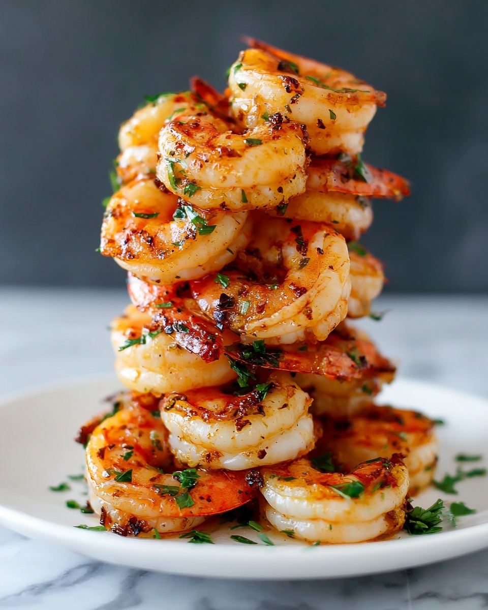 - Garnish and serve: Drizzle any remaining garlic butter from the skillet over the shrimp stacks. Garnish with additional parsley and lemon wedges for a fresh, zesty finish.