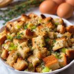 Grandma’s Thanksgiving Turkey Stuffing is a classic, savory side dish made with crisp bread cubes, sautéed onions and celery, and rich poultry seasoning, baked to golden perfection. Perfectly seasoned and moist, this stuffing is a holiday favorite that complements turkey beautifully.