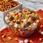 Start by grabbing a large mixing bowl and combining the Rice Chex cereal, mini pretzels, candy corn, halved peanut butter cups, Reese’s Pieces or M&M’s, and mini marshmallows. Gently toss everything together so you get a nice even distribution of all the goodies in every handful.