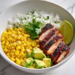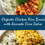 This Honey Chipotle Chicken Rice Bowl recipe features tender grilled chicken breasts marinated in a smoky, sweet chipotle adobo sauce, paired with a fresh avocado corn salsa. Served over fluffy rice and topped with crumbled queso fresco and lime wedges, this flavorful dish is perfect for a wholesome and vibrant meal.