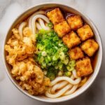 - Serve: Dish out the curry udon into bowls, topping each serving with the crispy tofu cubes. Garnish with sliced green onions for a fresh, vibrant finish.