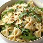 This refreshing Lemon Basil Parmesan Pasta Salad features bowtie pasta tossed with a zesty white balsamic vinaigrette, fresh basil, arugula, toasted pine nuts, and freshly grated Parmesan cheese. Perfect for a light lunch or a vibrant side dish, this salad offers bright citrus notes balanced by nutty parmesan and the subtle pepperiness of arugula, making it an elegant yet easy cold pasta dish to enjoy any time.