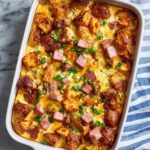In a separate bowl, mix together the shredded cheddar cheese, diced ham, and sliced green onions. Sprinkle this colorful, savory mixture over the chicken and potatoes. These toppings add creaminess, a touch of smoky saltiness, and fresh bursts of flavor and color that complete the casserole perfectly.