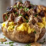 This Loaded Baked Potato with Steak Bites recipe is a hearty and satisfying meal perfect for family dinners. Crispy, fluffy baked russet potatoes are topped with juicy, flavorful steak bites and a rich Parmesan cream sauce infused with garlic, Cajun seasoning, and a hint of heat from red pepper flakes. With a perfect balance of textures and bold flavors, this dish is an impressive yet simple way to elevate classic comfort food.