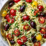 This orzo salad shines on its own, but it pairs wonderfully with grilled vegetables, warm pita bread, or a crisp green salad for a full Mediterranean-inspired meal. It’s also excellent alongside light seafood dishes, offering balance and satisfying textures.