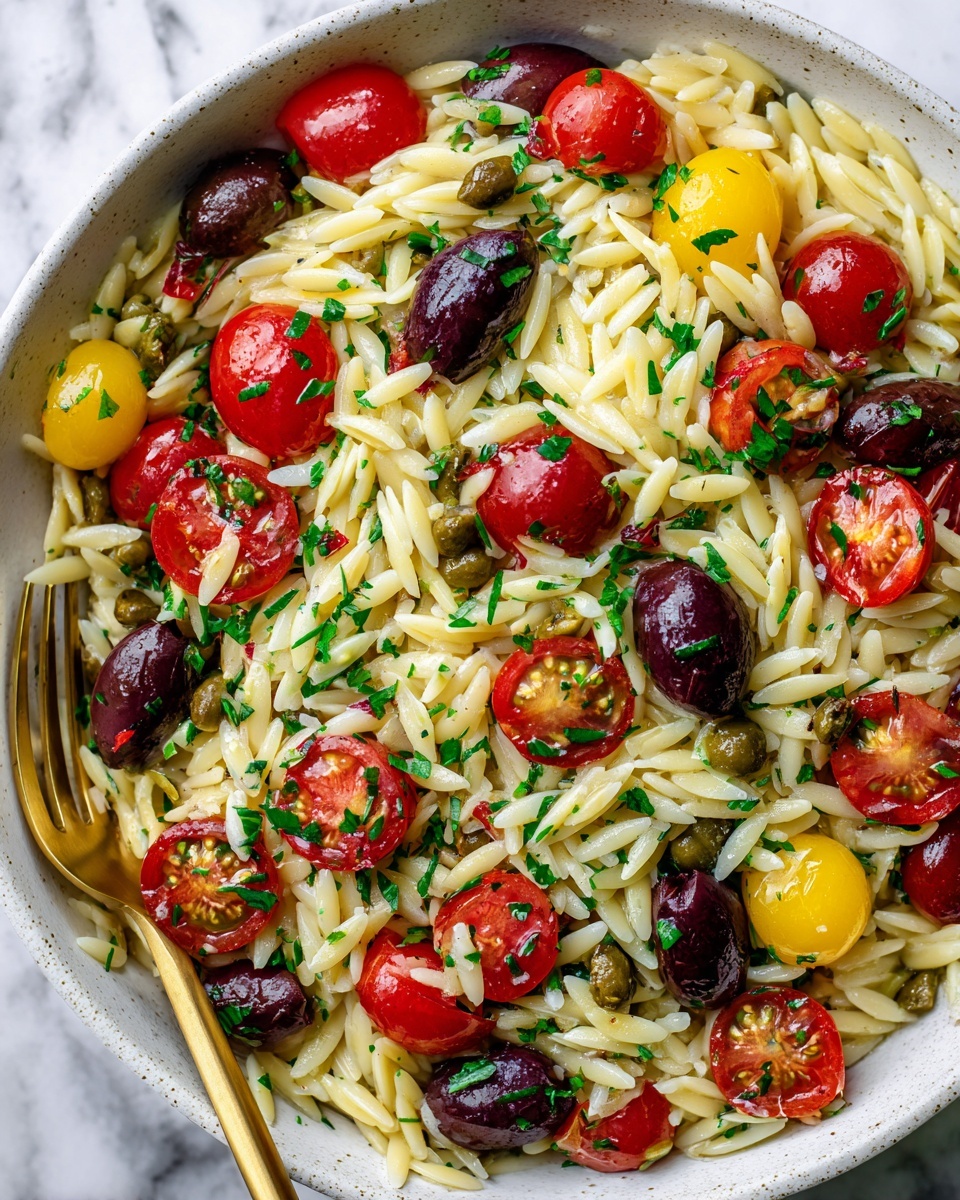 This orzo salad shines on its own, but it pairs wonderfully with grilled vegetables, warm pita bread, or a crisp green salad for a full Mediterranean-inspired meal. It’s also excellent alongside light seafood dishes, offering balance and satisfying textures.