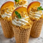 Delight in these Peach Cobbler Cheesecake Cones, a creative twist combining creamy cheesecake filling with warm peach cobbler topping and a buttery crumble, all served in crispy waffle cones. Perfect for a quick dessert that balances creamy, fruity, and crunchy textures.
