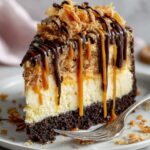 This Samoa Cheesecake is a rich and indulgent dessert inspired by the beloved Girl Scout Samoa cookies. Featuring a graham cracker and toasted coconut crust, the creamy coconut-infused filling is baked in a water bath for a smooth texture. Topped generously with caramel sauce, melted chocolate, more toasted coconut, and a sprinkle of sea salt, this cheesecake offers a perfect balance of sweet, creamy, and crunchy flavors that will delight any dessert lover.