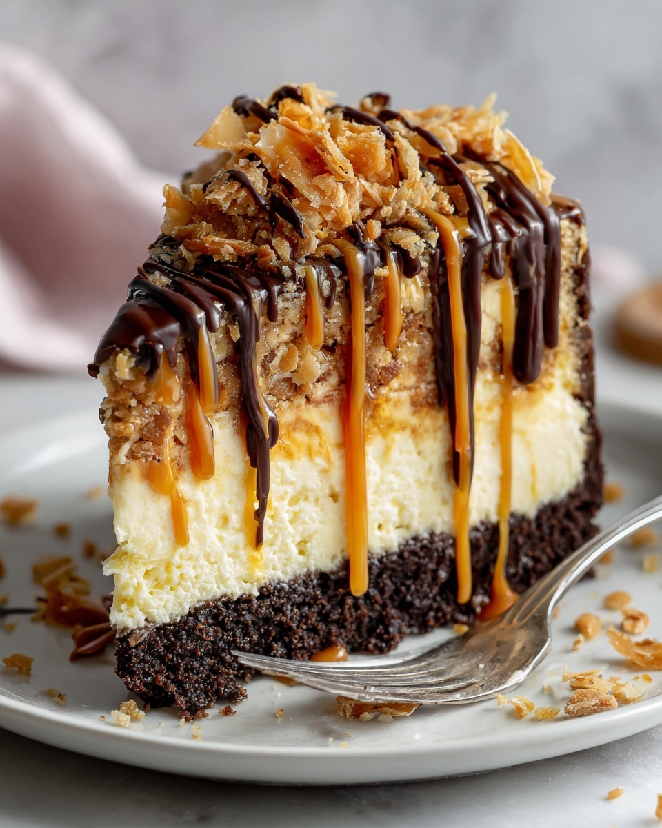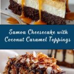 This Samoa Cheesecake is a rich and indulgent dessert inspired by the beloved Girl Scout Samoa cookies. Featuring a graham cracker and toasted coconut crust, the creamy coconut-infused filling is baked in a water bath for a smooth texture. Topped generously with caramel sauce, melted chocolate, more toasted coconut, and a sprinkle of sea salt, this cheesecake offers a perfect balance of sweet, creamy, and crunchy flavors that will delight any dessert lover.