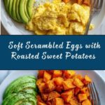 5. Serve: Plate a portion of roasted sweet potatoes alongside a scoop of the soft scrambled eggs. Optionally, sprinkle crumbled feta or goat cheese on top and garnish with chopped fresh chives or parsley for a fresh finish.