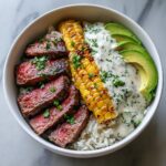Start by placing your cooked rice or quinoa at the base of the bowl. Then layer on the roasted corn, creamy avocado slices, halved cherry tomatoes, and finely chopped red onion. Top everything off with the thin steak slices. Sprinkle freshly chopped cilantro and drizzle with lime juice to bring a zesty freshness that ties all the ingredients together beautifully. If you like, add a dollop of sour cream or Greek yogurt for a creamy contrast.