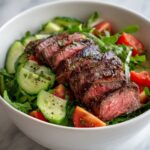 - Prepare the salad base: While the steak rests, combine the mixed greens or shredded romaine, halved cherry tomatoes, thinly sliced red onion, cucumber, fresh cilantro leaves, and mint leaves in a large salad bowl.